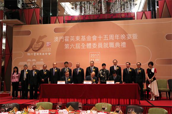 11月9日晚,澳门霍英东基金会成立十五周年晚宴暨第六届全体委员就职典礼在澳门举行,期间举行澳门霍英东基金会向中国器官移植发展基金会、中山大学教育发展基金会捐赠经费签约仪式。全国政协副主席何厚铧、澳门特别行政区行政长官崔世安、中央人民政府驻澳门特别行政区联络办公室主任郑晓松、外交部驻澳门特别行政区特派员公署特派员叶大波、澳门霍英东基金会信托委员会主席霍震寰、霍英东集团主席兼澳门霍英东基金会信托委员代表霍震霆、澳门霍英东基金会监事长崔世昌、澳门霍英东基金会行政委员会主席霍启山等,中山大学粤港澳发展研究院副理事长郑德涛、中山大学教育发展基金会执行副理事长陈绍彬等200多位嘉宾出席典礼,并见证签约仪式。